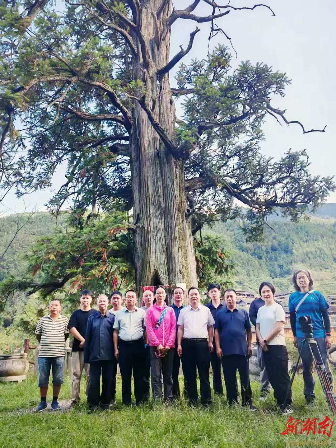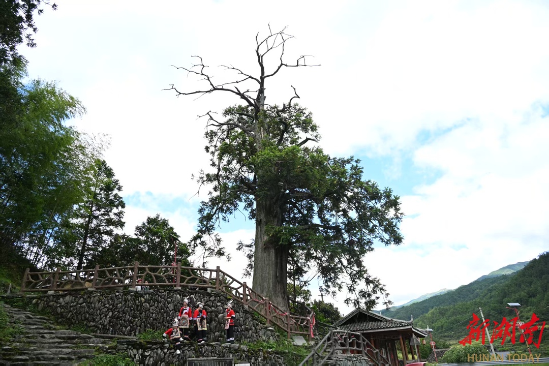 于是,赶着在9月11日完成了省里的汇报工作。9月12日清晨,我与市林业局两位同志一同出发。前往城步,沿途变化显著——我曾在城步工作过6年,担任过副县长、县委办主任、纪委书记,20多年前走这条路,要颠簸6个多小时,如今全程水泥路面,时间缩短近半。想不到一场央视采访,又让我重温旧梦,重走“长征路”!中午时分,我们抵达长安营镇大寨社区,与央视摄制组会合,按当地风俗,主人先奉上油茶。“一碗强盗、二碗贼、三碗四碗才是客”,为表尊重,我连喝了四碗,感受这熟悉而又久违的苗乡风味。同时,又见到了那株死而复生的“杉树王”,它静静屹立,四周已设置不锈钢护栏,树下溪水潺潺,树冠在阳光下舒展,显得生机盎然。
