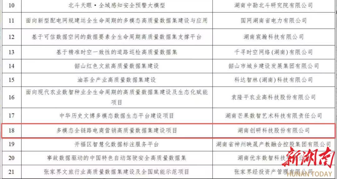 新湖南客户端4月29日讯(通讯员 谢建波)2026年4月,湖南省数据局正式公布2026年首批高质量数据集先行先试项目名单。湖南创研科技股份有限公司申报的《多模态全链路电商营销高质量数据集建设项目》经择优推荐、严格筛选与专家评审,成功入选。