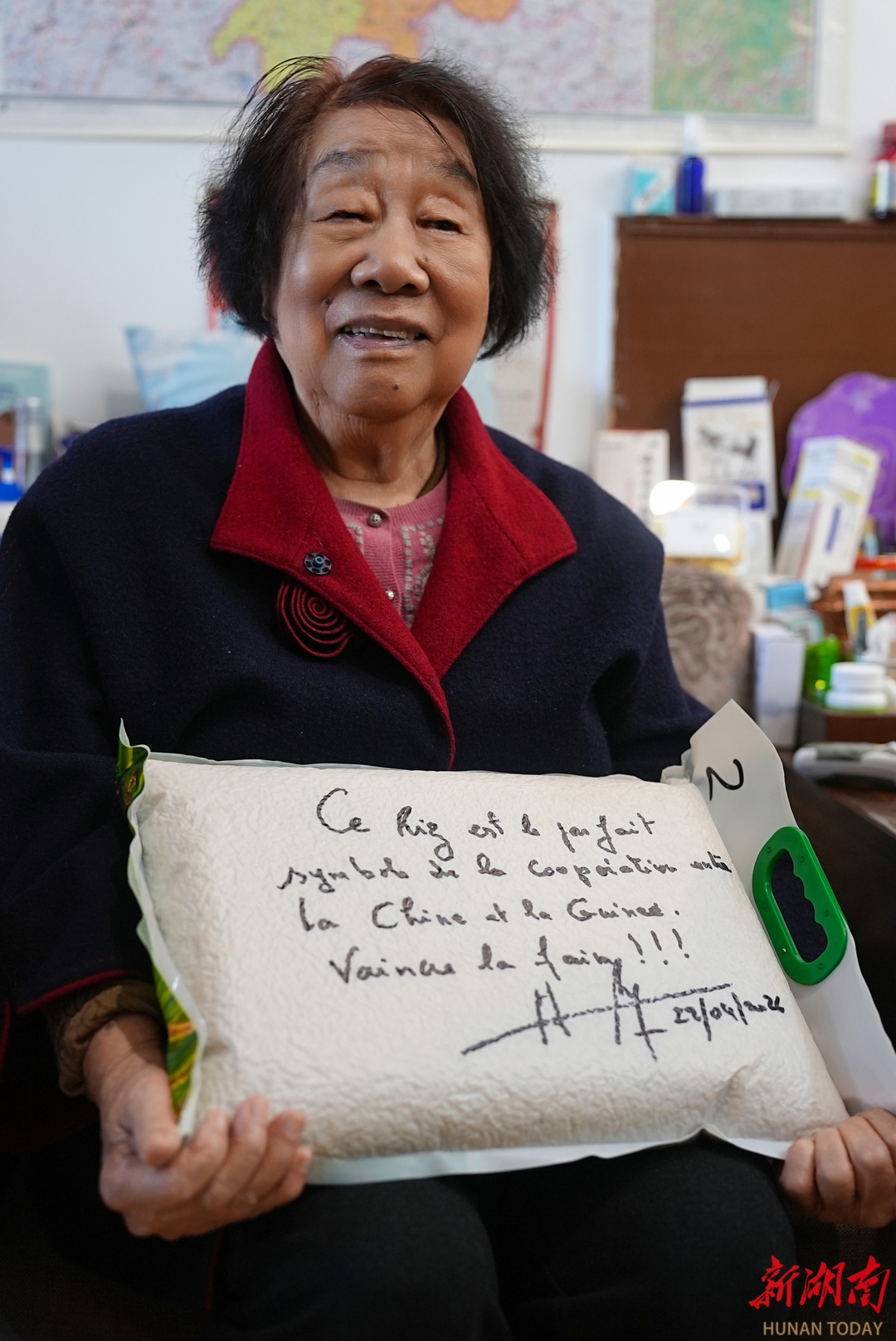 4月29日上午,方志辉研究员缓步来到袁隆平院士生前家中。他双手捧着一个朴实的米袋,袋身正面印着几内亚与中国的国旗,以及杂交水稻稻穗的图案,袋身背面是几内亚总理的题词。作为袁隆平院士的弟子,他肩负着几内亚政府和人民的嘱托,脚步沉稳地走向袁隆平夫人邓则女士。
