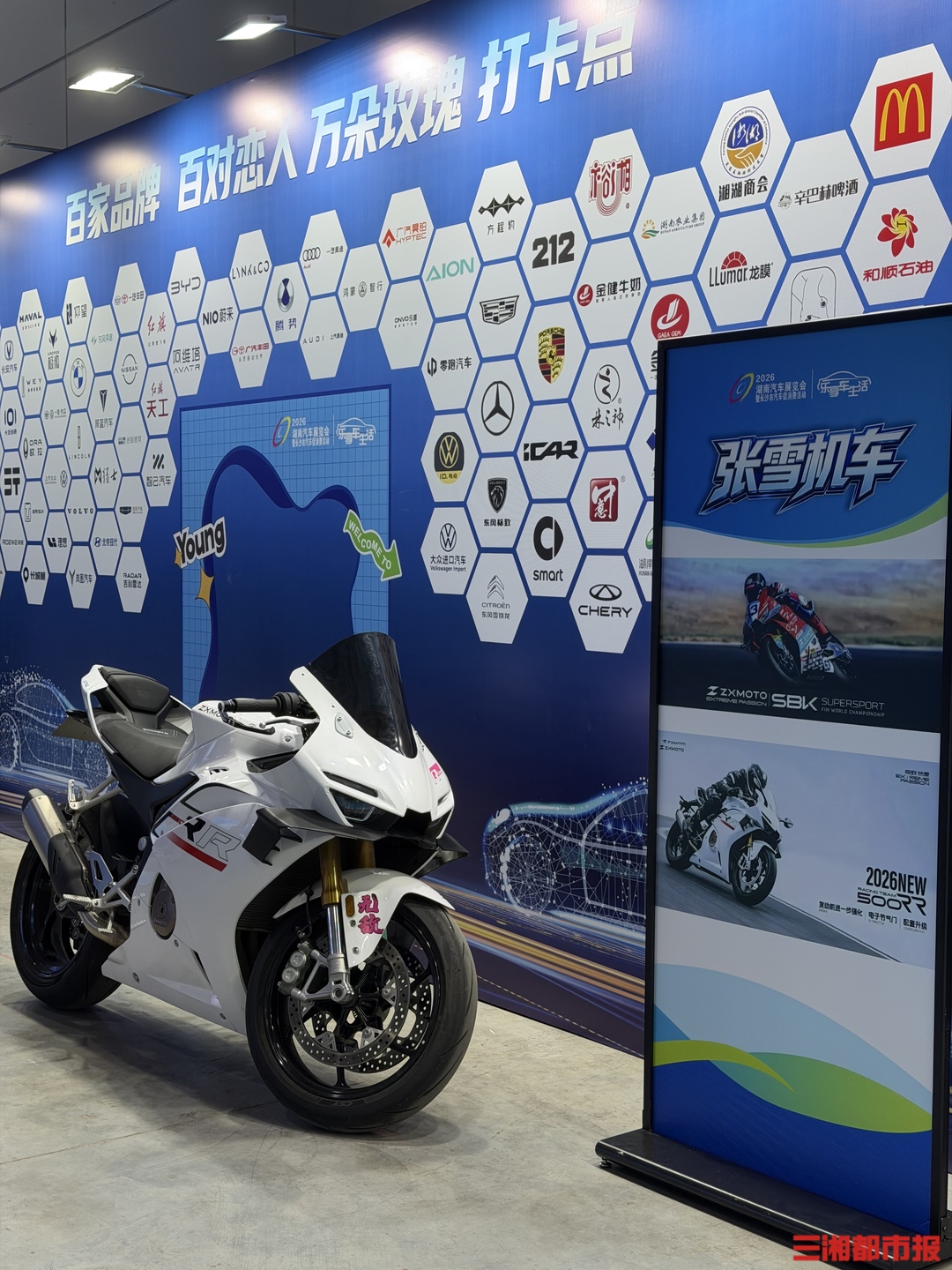 4月29日,湖南国际会展中心,张雪ZX500RR摩托车亮相2026湖南车展,明日车展正式开幕,欢迎大家前来打卡!(视频 袁红霞 龙思言)