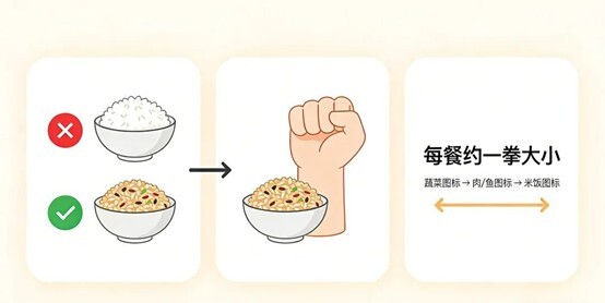 控制分量,一拳原则。每顿主食摄入量大约相当于你自己一个拳头的大小,不管红薯还是米饭都按这个标准,简单好记不超标。