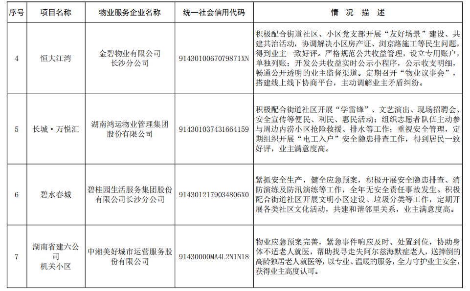 据悉,长沙已建立物业企业常态化信用管理机制,季度服务考评结果将统一录入“住建一体化”信息平台,作为企业信用评分、评优评先、项目招投标的重要依据。
