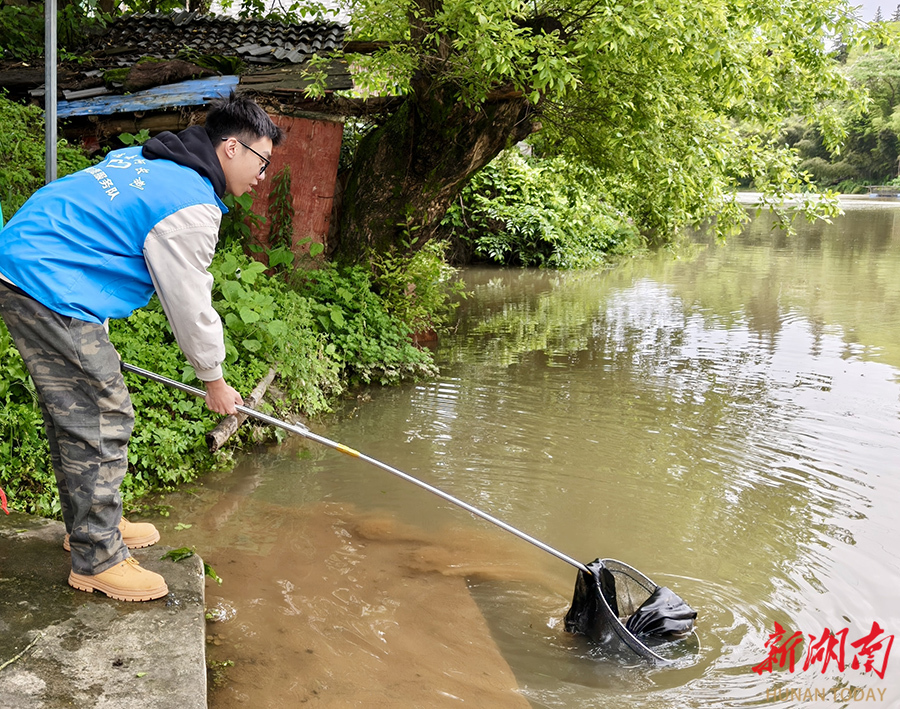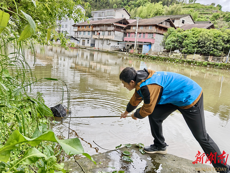 4月29日,志愿者在清理河面垃圾。当天,通道侗族自治县阳光社会工作服务中心组织“河小青”志愿者在寨上水源区清理河道漂浮物及沿岸垃圾,用实际行动守护饮用水源安全,展现生态环保担当。 陈俊宇 杨美兰 摄影报道(湖南图片库)