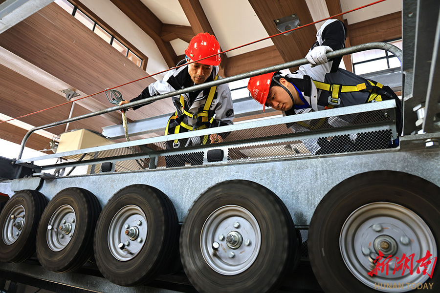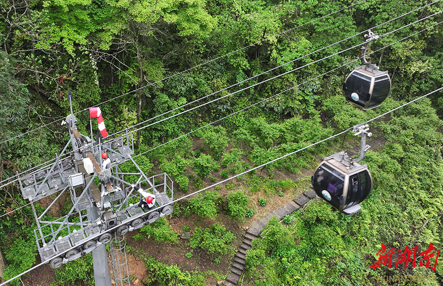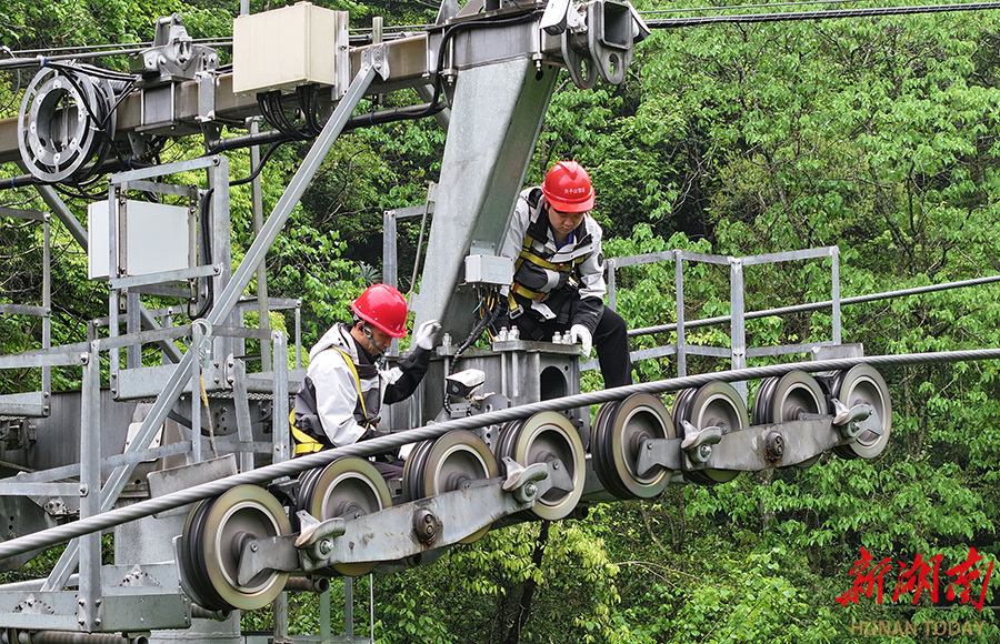 4月29日,张家界国家森林公园天子山索道工作人员对索道运行设施进行检查维护。“五一”假期临近,张家界国家森林公园加强客运索道日常巡检和维护保养,及时排除隐患,保障假期旅游安全。吴勇兵 摄(湖南图片库)