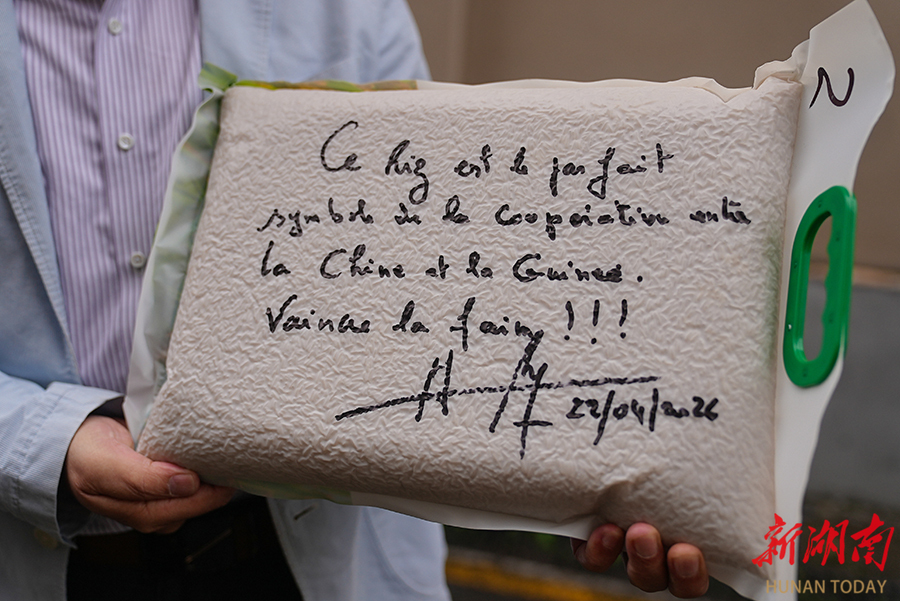 4月29日,袁隆平院士弟子方志辉(右)将产自几内亚本土的杂交水稻大米,交到袁隆平院士遗孀邓则女士手中。这份写有该国总理亲笔寄语“这袋大米是中几合作的完美象征。战胜饥饿!!!”的珍贵礼物,见证了杂交水稻技术在几内亚成功推广的成果。目前,杂交水稻技术扎根几内亚,已在当地建成一万公顷种植基地,并计划扩至四万公顷。这不仅标志着几内亚有望通过杂交水稻规模化种植实现粮食自给,也承载着对袁隆平院士"发展杂交水稻,造福世界人民"崇高精神的深切缅怀。 湖南日报全媒体记者 傅聪 邹尚奇 周浩宇 摄影报道