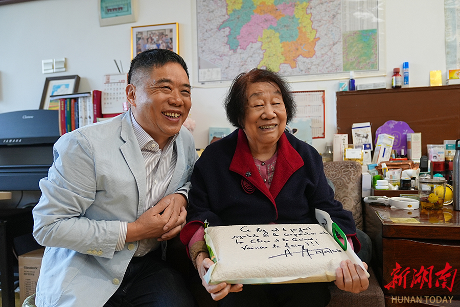 4月29日,袁隆平院士弟子方志辉(左)将产自几内亚本土的杂交水稻大米,交到袁隆平院士遗孀邓则女士手中。