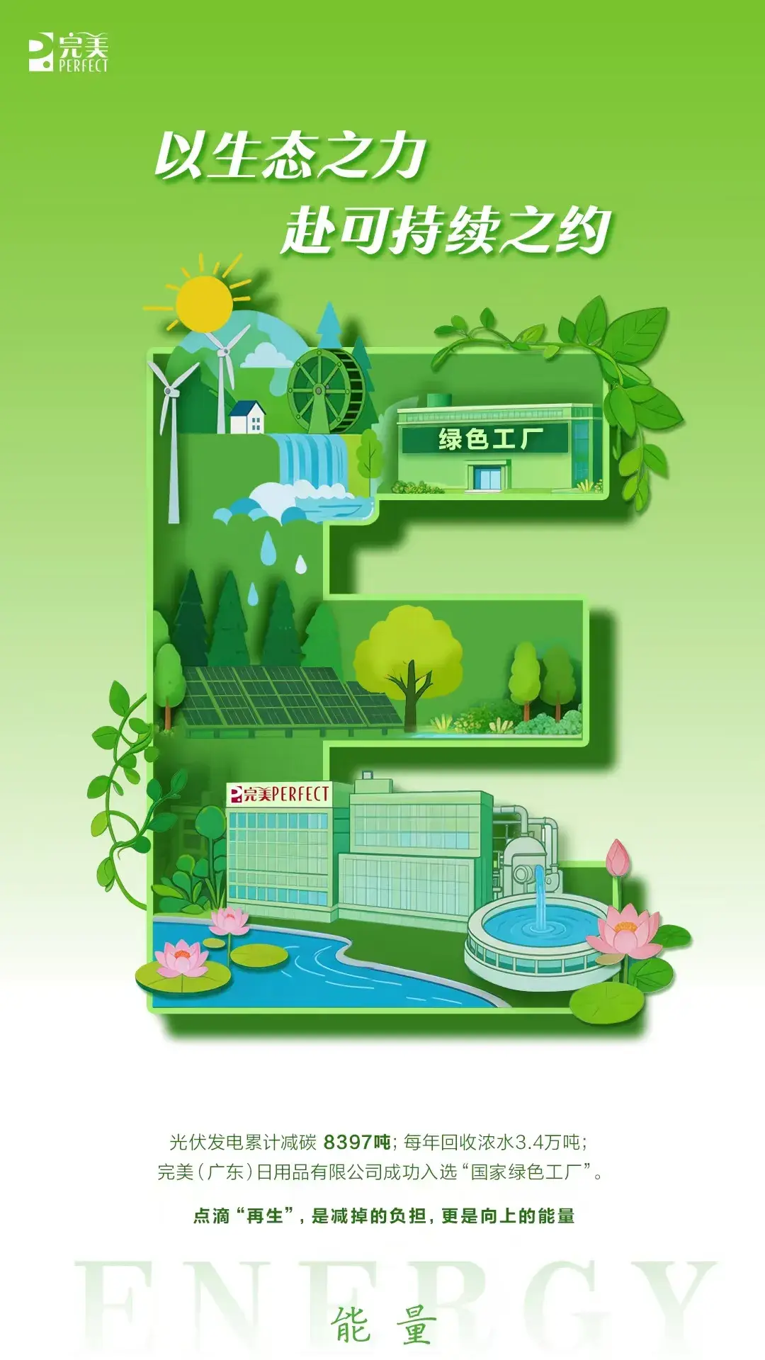 完美华南基地建设之初,完美就将光伏节电、水循环利用纳入厂区整体规划,基地同步建立了全员参与的绿色生产管理制度,从车间节能降耗到办公区无纸化办公,让每一位员工都成为绿色发展的参与者。华南基地投用至今,光伏系统累计减碳8397吨,年回收浓水3.4万吨。正是这份从源头做起、全员参与的绿色布局,让完美(广东)日用品有限公司入选“国家绿色工厂”,并斩获中国“一级绿色仓库(三星)”称号。