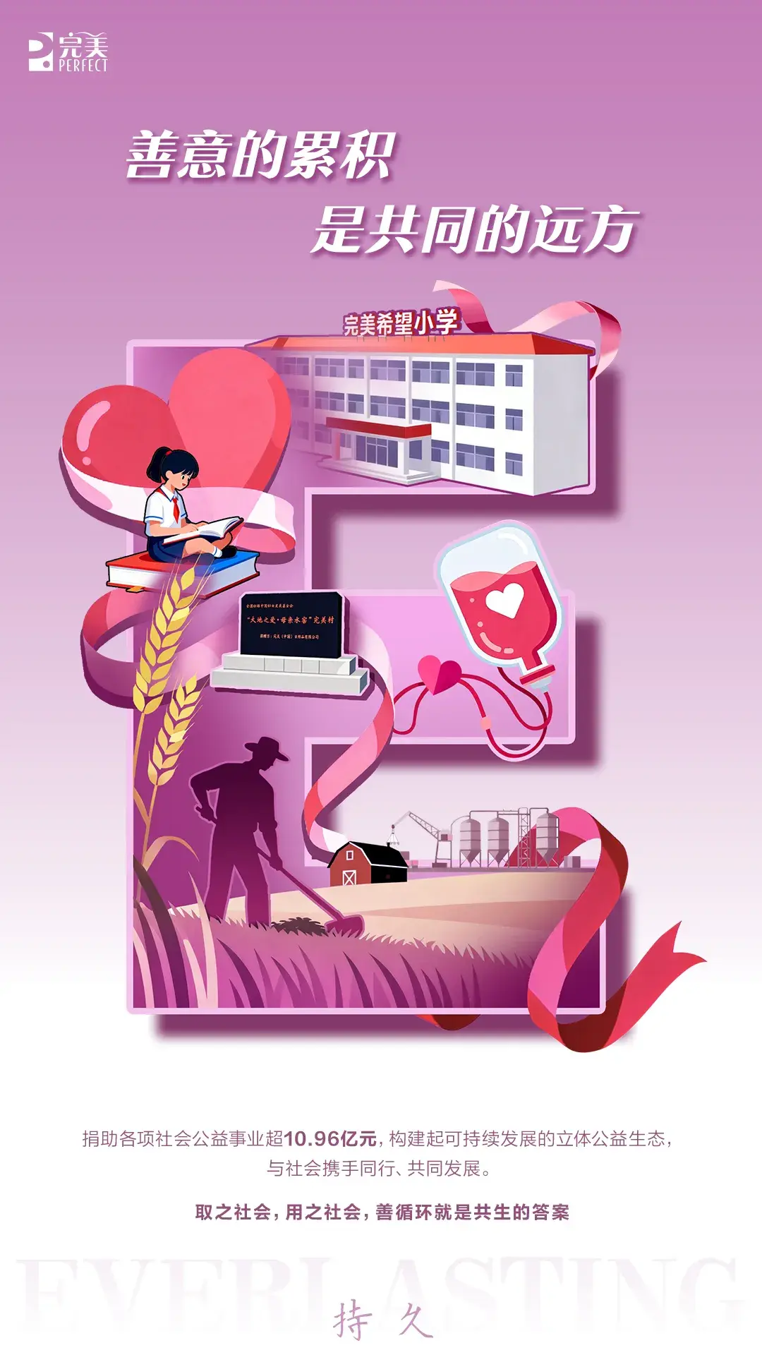 “取之社会,用之社会”,是完美从创业之初就践行的公益理念。截至目前,完美累计向社会公益事业捐资超10.96亿元,覆盖希望工程、无偿献血、禁毒宣传、乡村振兴等多个领域。历经32年努力,最终消费者更信任完美,创业伙伴、员工与完美品牌的凝聚力更强。