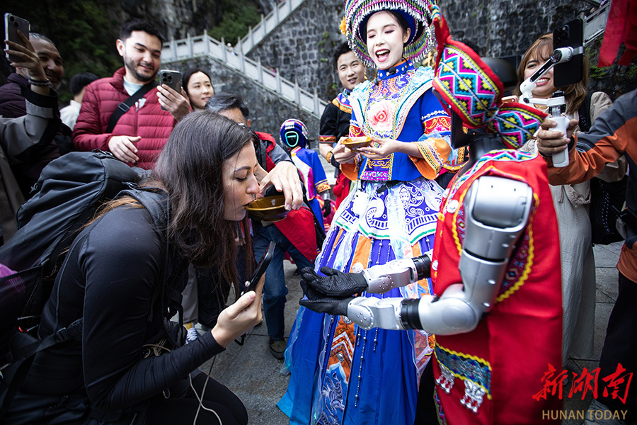 4月30日,外国游客在品尝智能机器人递上的美酒。“五一”假期,张家界天门山景区推出一系列融合非遗与科技的特色文旅活动。活动以土家非遗民俗秀为主题,巧妙融入时下流行的科技创意,打造一场非遗古韵与数字科技浪漫邂逅的沉浸式民俗狂欢。吴光明 摄(湖南图片库)