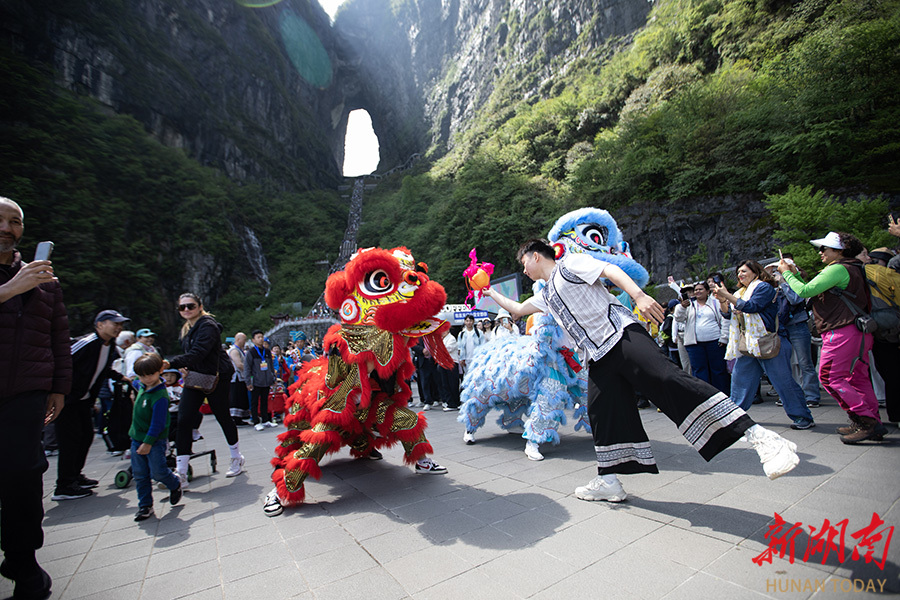 4月30日,游客在观看土家非遗民俗表演。“五一”假期,张家界天门山景区推出一系列融合非遗与科技的特色文旅活动。活动以土家非遗民俗秀为主题,巧妙融入时下流行的科技创意,打造一场非遗古韵与数字科技浪漫邂逅的沉浸式民俗狂欢。吴光明 摄(湖南图片库)